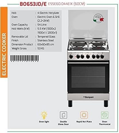 - Firstly, Bompani Electric Cooker 4 HOT Plates Electric Oven & Grill Size ( 60 x 60 ) cm Silver Model ESSE60044EIX -1 Years Full Warranty. Bompani (60 x 60) cm Electric Cooker 4 HOT Plates Electric Oven, Silver Model – ESSE60044EIX