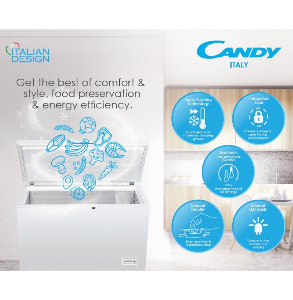 To summarize, the Candy 230 Liter Chest Freezer Single Door White Model- CHCH230LEG.