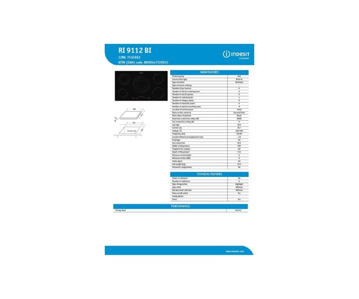 • Indesit 90cm 5 Cook Zone Ceramic Hob ‎RI-9112B, ceramic hobs are energy-efficient, helping you save on energy costs.