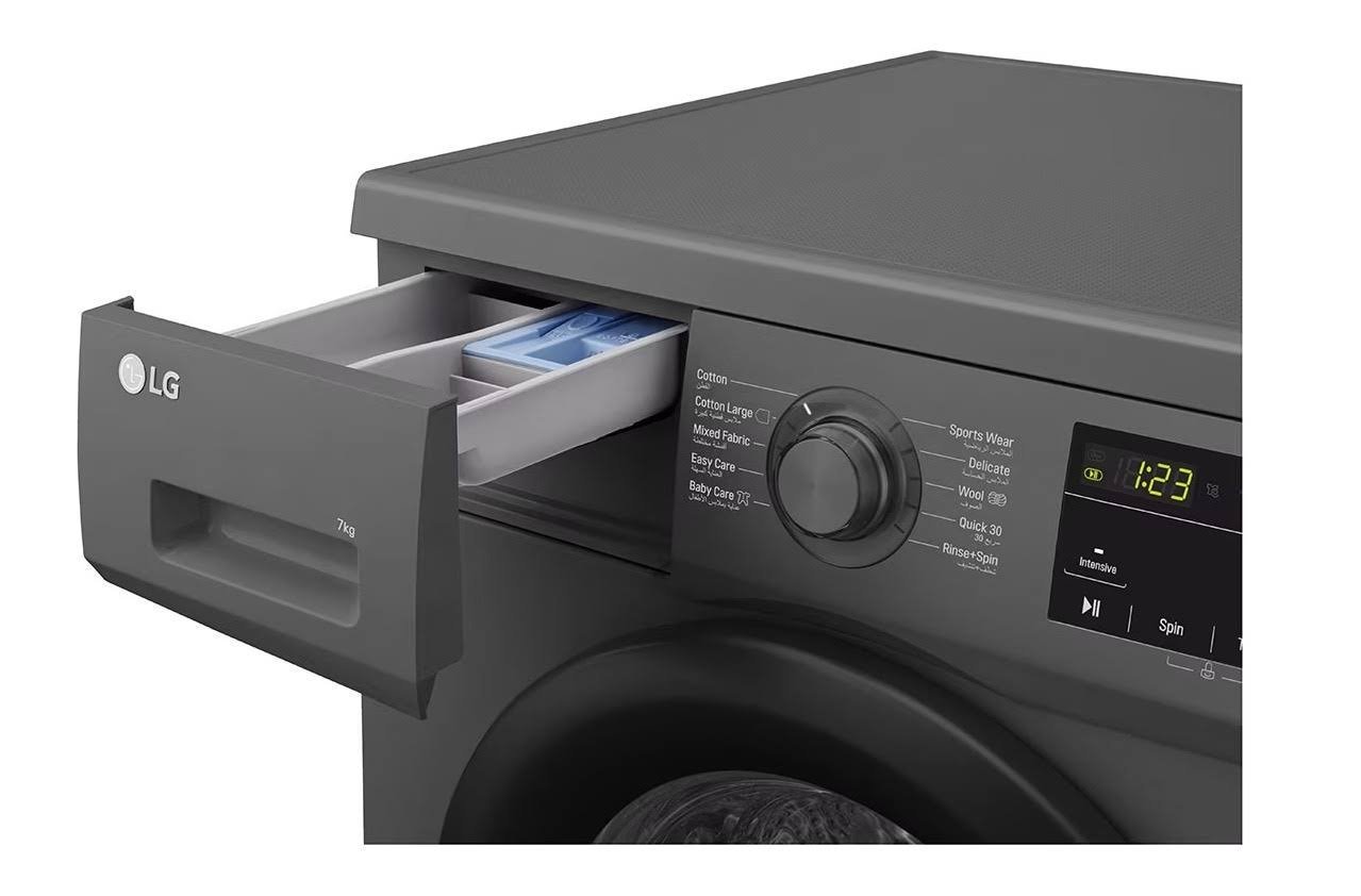 LG Front Load Washing Machine F2J3HYL6J With a 7kg capacity, it offers ample space for washing a moderate amount of clothes in one cycle, making it suitable for small to medium-sized households.