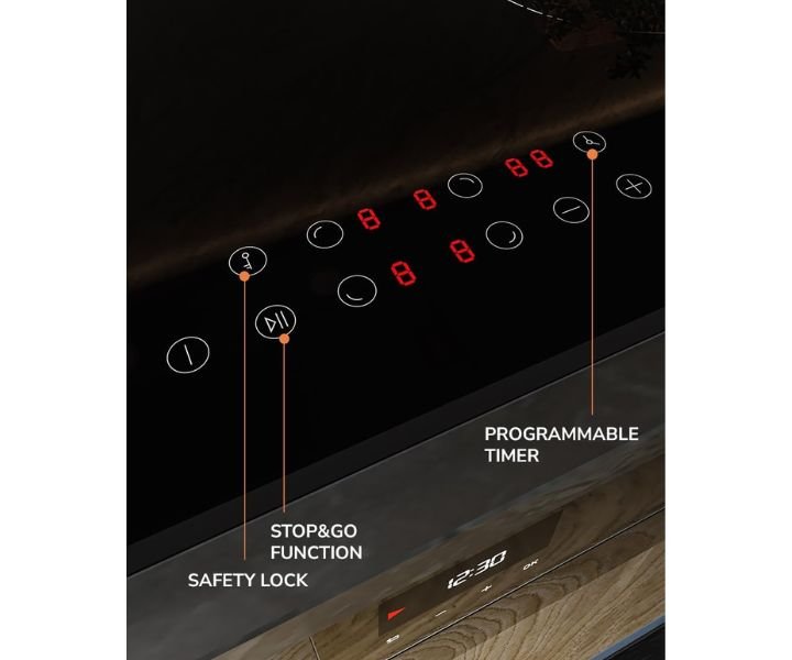 - Safety Lock Feature: The lock button ensures safety by moreover preventing accidental activation or deactivation of the cooktop. A red indicator light signals when the device is locked.