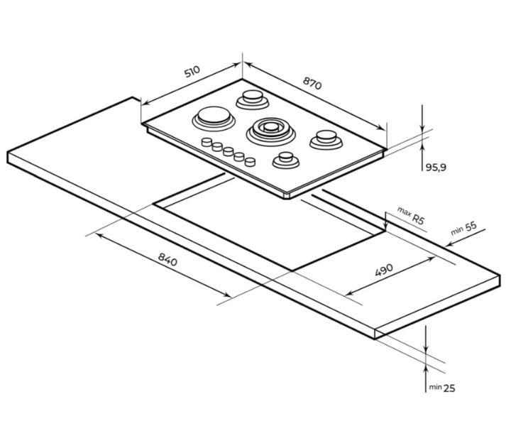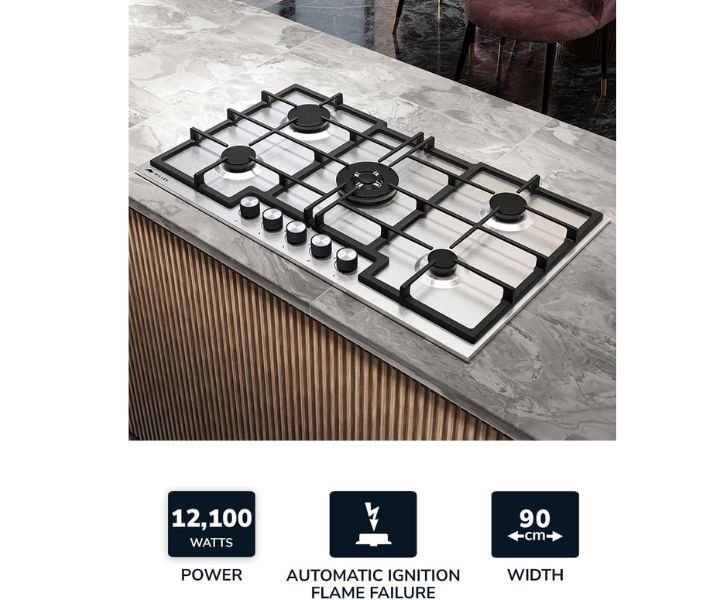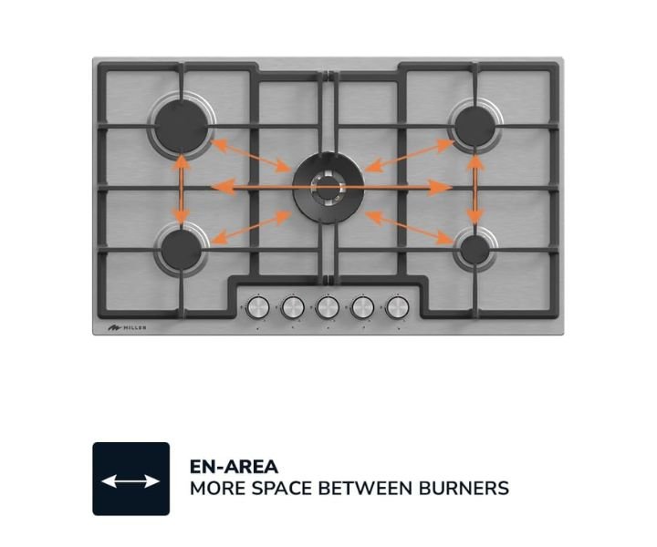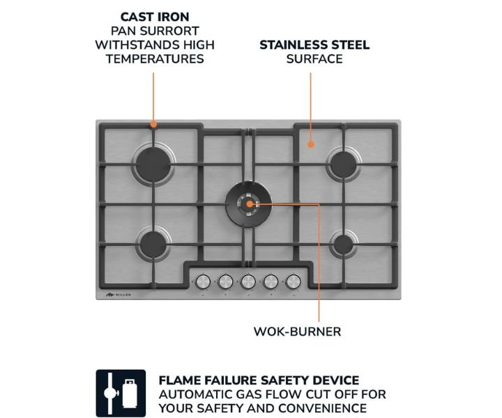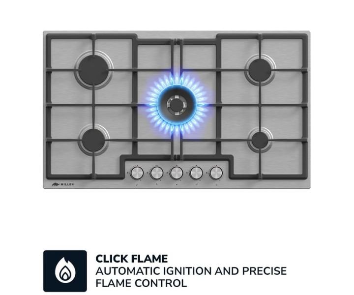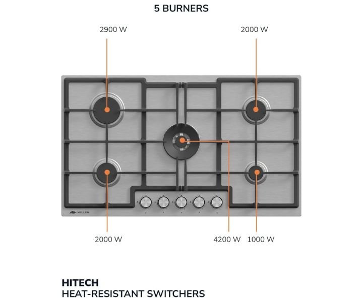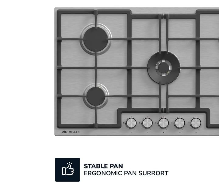 Firstly: Superior Cooking Power: The MILLEN Gas Cooktop boasts five burners powered by Italian gas valves SABAF, providing precise heat control and exceptional cooking performance.