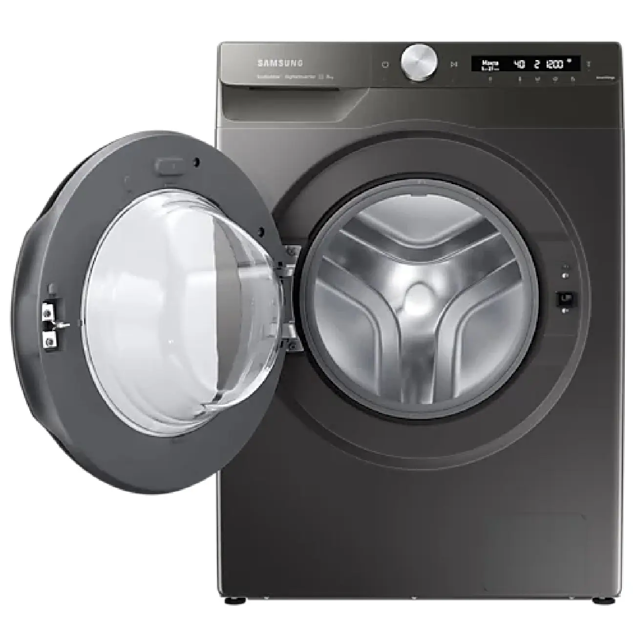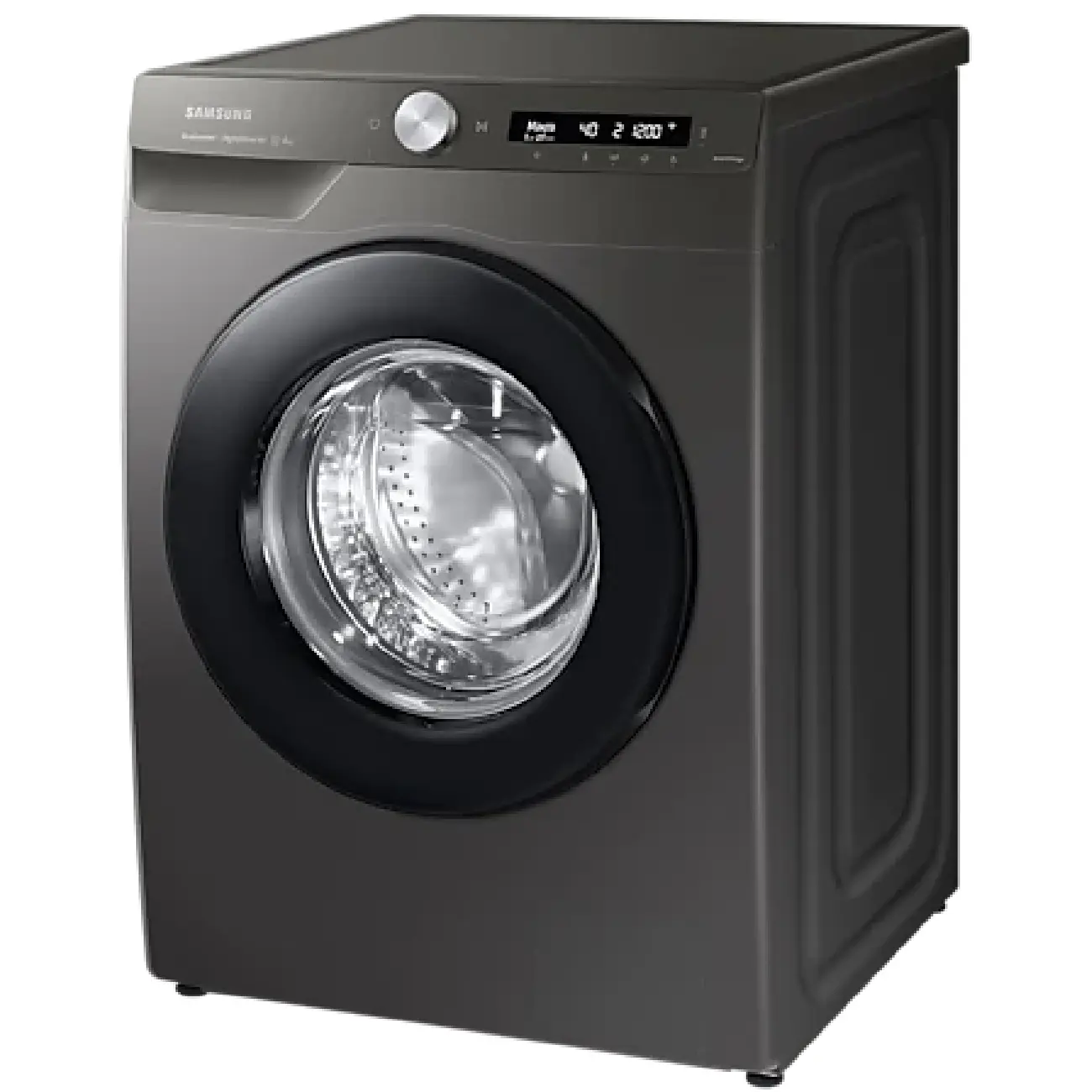 - The Samsung front-loading washing machine with black design will fit into the interior of the kitchen or bathroom.