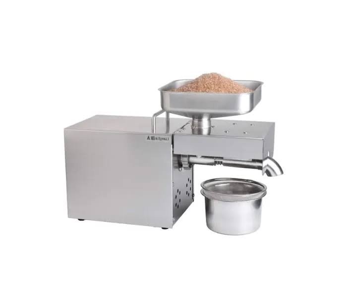 The oil press machine features a user-friendly interface with clear controls for smooth operation.