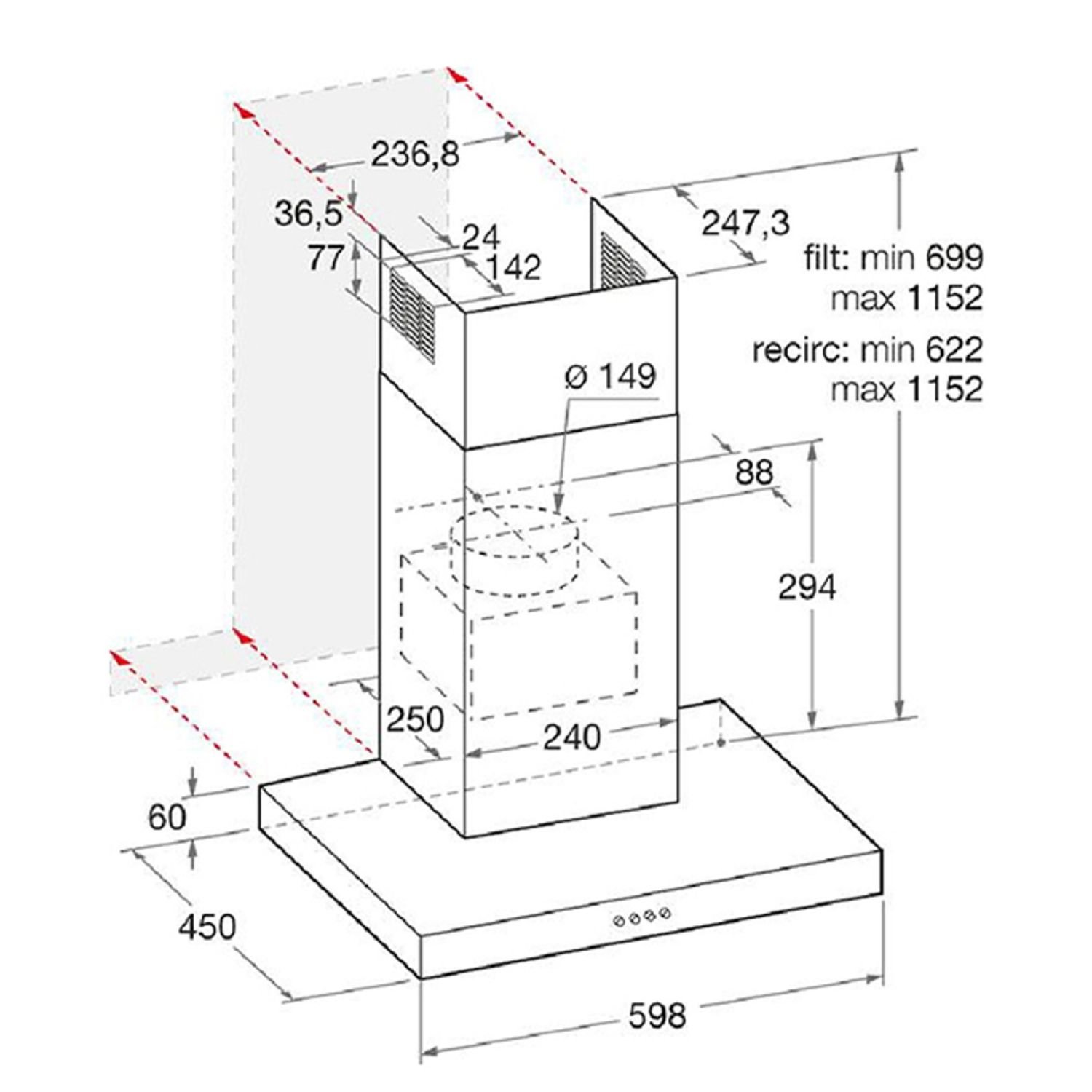 Ariston Built In 60cm Chimney Hood, Telescopic, Wall mounted, Washable Filter, 3 Speed Settings, Stainless Steel Material, Mechanical Control, Self Supporting Metallic Filter, Inox, AHBS6-7FLLX