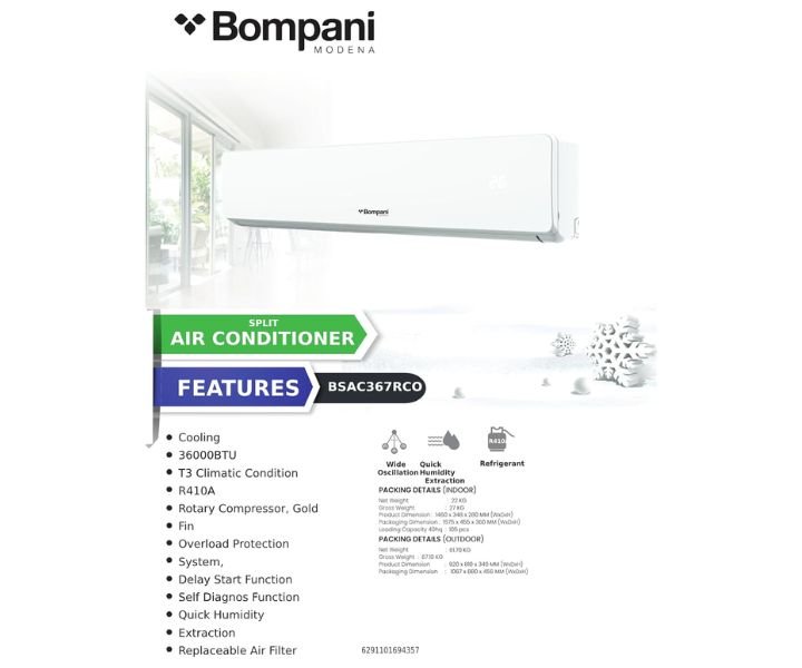 - Firstly, Bompani Split Air Conditioner 3 Ton 36,000 BTU Gas R22 T3 Rotary Super Tropical Compressor Model BSAC367RCO– 5 Years Warranty. Bompani 3 Ton Split Air Conditioner, White Model – BSAC367RCO. Bompani Italy Offers Brand Warranty:-