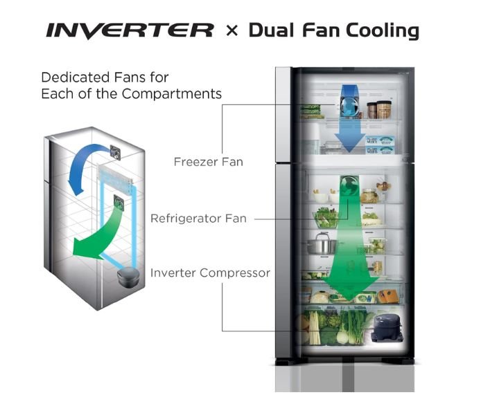 Hitachi : Inverter x Dual Fan Cooling (Dedicated Fans for Each Compartments )