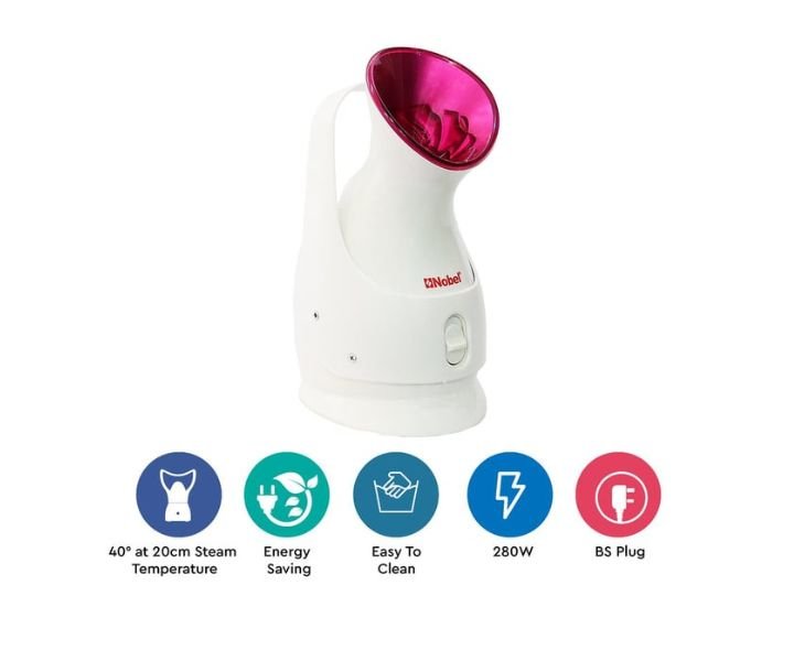 Enhance your skincare routine with the Nobel Face Steamer’s compact and stylish design, available in white and pink. It not only revitalizes your skin but also complements your vanity or bathroom decor.